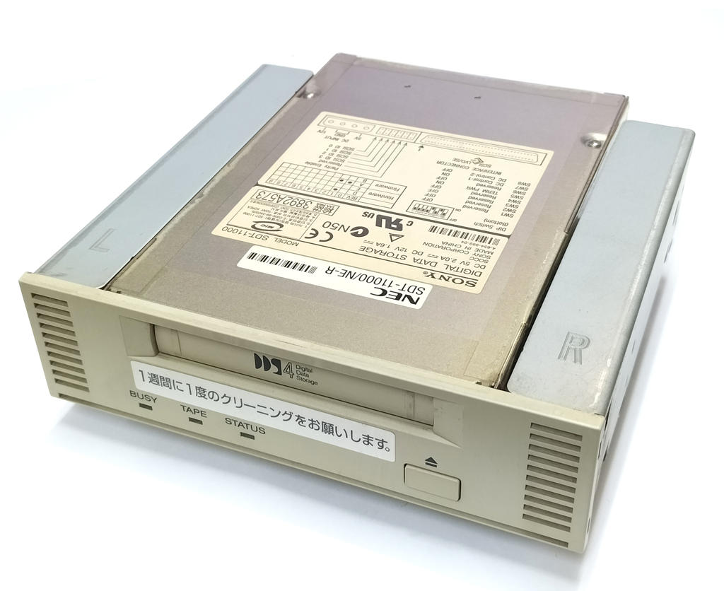 NEC Express5800シリーズのPCサーバ用の内蔵型DDS4 DATドライブです。 型番は、SDT-11000/NE-R となります。 ドライブ自体は、SONY製(SDT-11000) になります。 非圧縮時:20GB、圧縮時:40GBのバックアップが可能です。 接続インターフェースは SCSI 68ピンです。 通電と、テープメディアの挿入、排出に問題がないことを確認しています。 Windows XP機と接続しましたが、ドライバがあたって正常に認識されている状態です。 クリーニングテープを使ったクリーニング、そして読み込み書き込みテストを行い正常であることを確認しています。 付属品はありません。