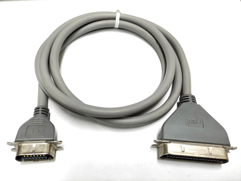 NECのPC-9800シリーズ用の純正プリンタケーブルです。 パソコン本体側のコネクタは、アンフェノールフルピッチ14pinです。 プリンタ側のコネクタはアンフェノールフルピッチ36pinです。 PC-9800シリーズ以外にも、PC-6000シリーズ、PC-6600シリーズ、PC-8000シリーズ、PC-8800シリーズにも使えます。 最初期のプリンタケーブルで、データはパソコン本体からプリンタに対して一方方向で通信します。 後の時代にMicrosoft Windows Printing Systemが登場し、プリンタポートの双方向通信が必要になり、パソコン本体側のプリンタポートもアンフェノールハーフピッチ36pinになりました。 この14pinタイプのプリンタケーブルはそれ以前の規格のプリンタケーブルになります。